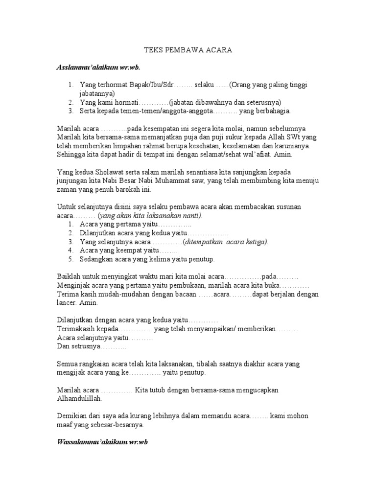Contoh teks pembawa acara pernikahan (walimatu 'ary). Selamat malam dan salam sejahtera untuk kita semua. Sambutan ketua panitia halal bihalal. Keberadaan mc diperlukan untuk memandu jalannya sebuah acara, supaya sebuah acara tersebut bisa berjalan dengan baik serta tertata rapi. Selamat datang dalam perayaan natal bersama rukun st.clara, wilayah 5 paroki st.fransiskus assisi makassar tgl 28 des 2017.